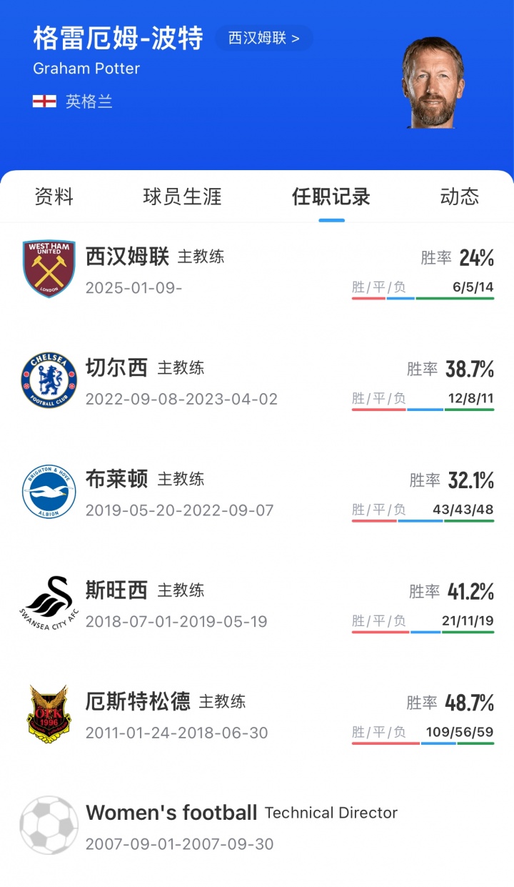 开赛1胜4负排19!官方:西汉姆联主帅波特下课,执教25场仅取6胜