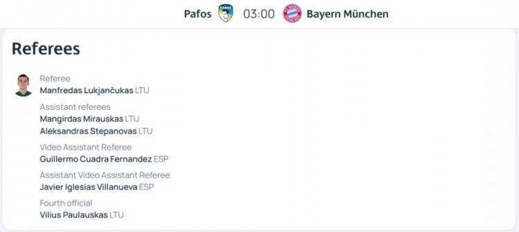 拜仁客战帕福斯裁判 组名单:立陶宛主裁执法,西班牙人VAR裁判 组