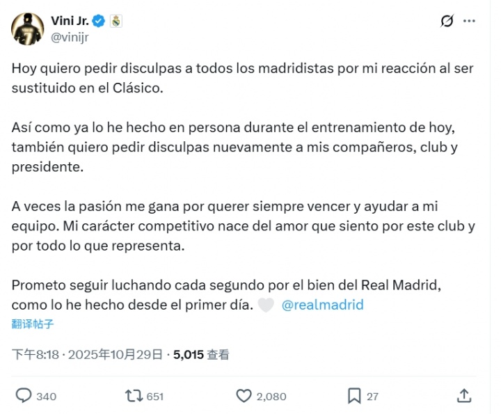10月29日讯 皇马翼锋维尼修斯在社媒发布了一则道歉声明,因在国家德比中被换下时的争议行为向球迷、队友、球队和俱乐部主席道歉,而致歉中并未提到主帅阿隆索。