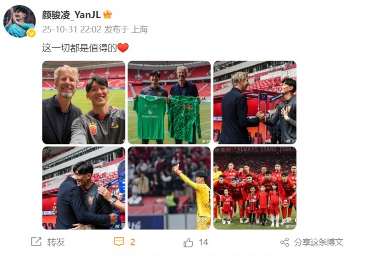 赛后,海港守门员颜骏凌晒出了与偶像范德萨的合照,并写道:这一切都是值得的。