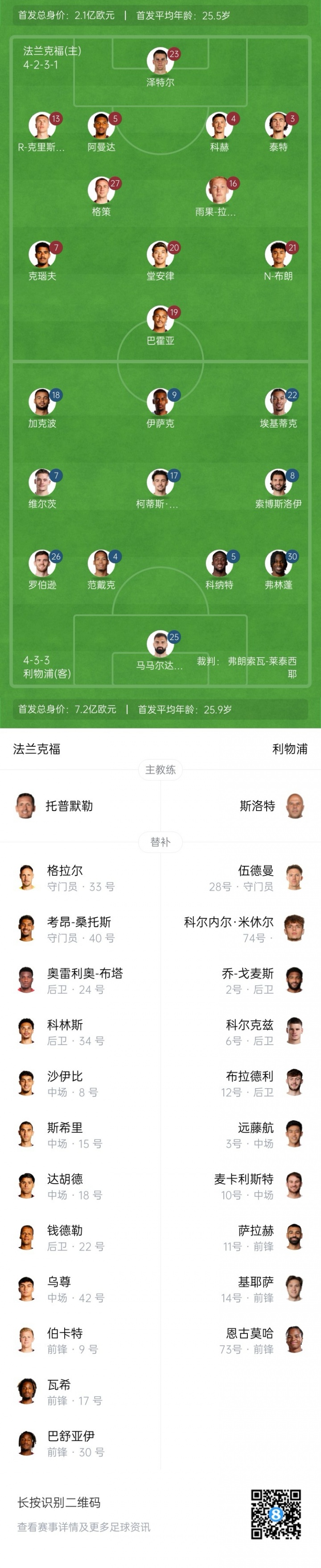 10月23日讯 欧冠职业联赛 阶段第3轮,利物浦客战法兰克福,赛前双方杆位公布。【利物浦方面,伊萨克、维尔茨、加克波悉数先发,埃基蒂克将面对旧主;法兰克福方面,英超直播堂安律、拉尔森、布朗领衔先发】
