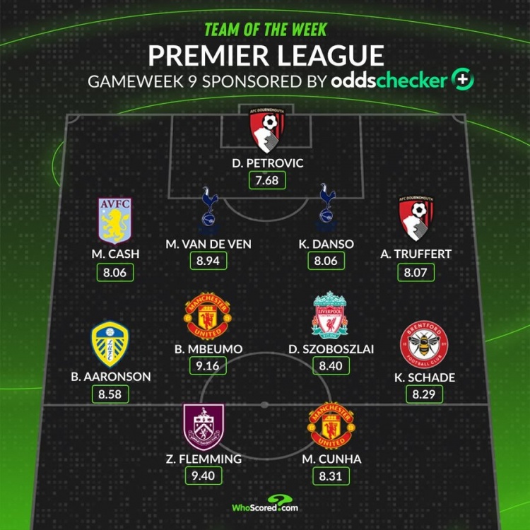 10月27日讯 英超职业联赛 第9轮已经完赛,whoscored也列出了本轮英超评分最佳阵,曼联、热刺和伯恩茅斯各2将入围。