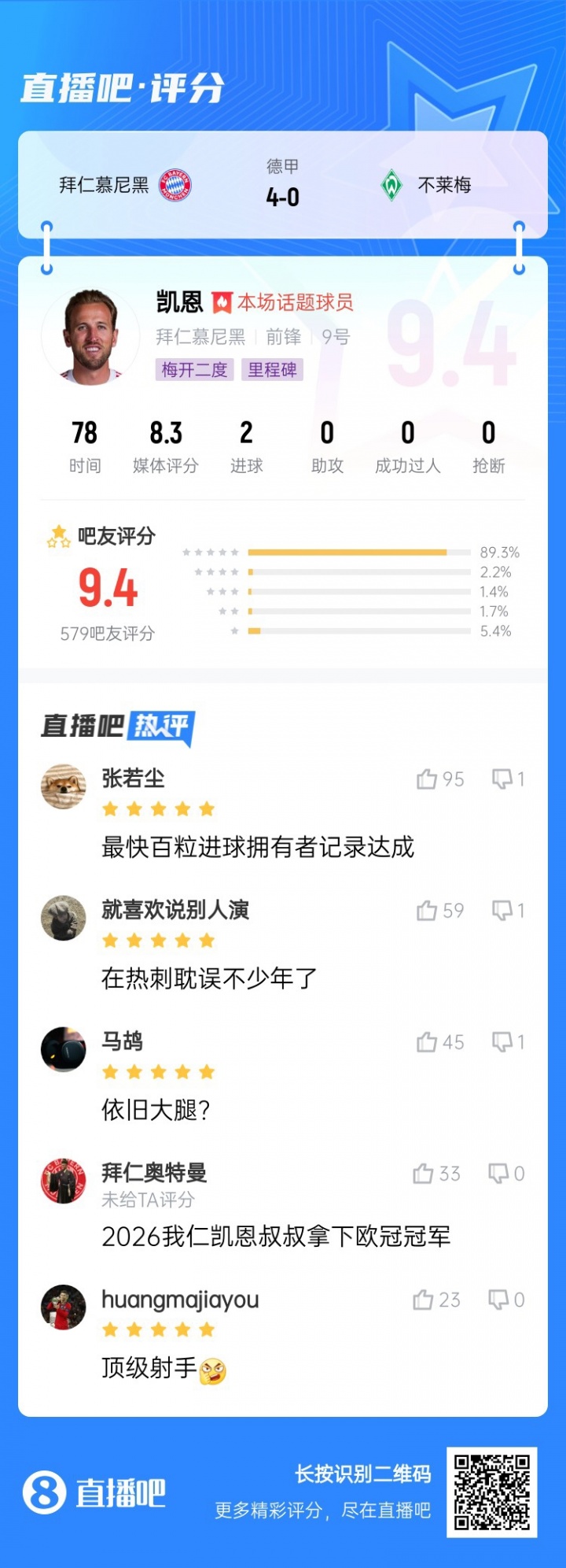 第五轮评选结果结出炉,凯恩连进两球斩获个人拜仁百球,帮助拜仁4-0击败不莱梅,24直播网获得吧友4万多票支持,当选【X小红书德甲第5轮最佳球员】!