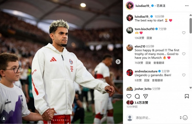 本场赛事 新援路易斯-迪亚斯破门,打进拜仁生涯首球,英超免费在线高清直播他也在个人社媒晒出本场入场时照片,配文写道:“以最好的方式开启新赛季🏆❤️”