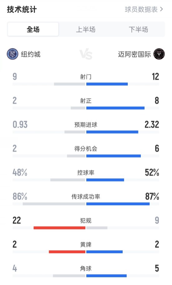 纽约城0-4迈阿密国际数据:射球 9-12,射正2-8,盘带时间 48%-52%
