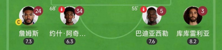 在下半场,巴迪亚西勒和客串上场的阿奇姆彭先后伤退,此时能换上场的只剩兼打中卫的19岁新援哈托。因此,切尔西在最后半小时里,是左边卫哈托和右边卫领队 詹姆斯兼职中卫。