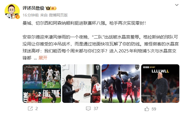 10月30日讯 职业联赛 杯结束多场对阵,其中利物浦大败 于水晶宫,无缘晋级下一轮 。赛后评述员詹俊发文。