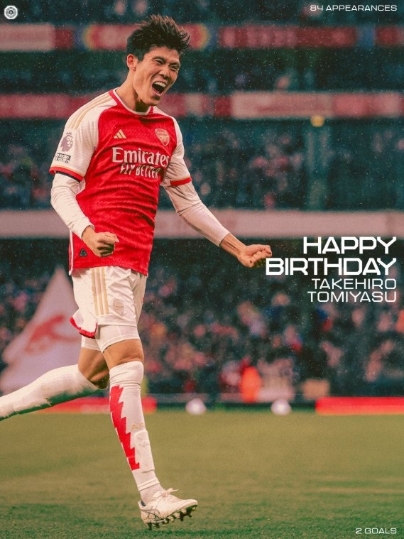 11月5日讯 阿森纳官方发文,为旧将富安健洋庆祝27岁生日。