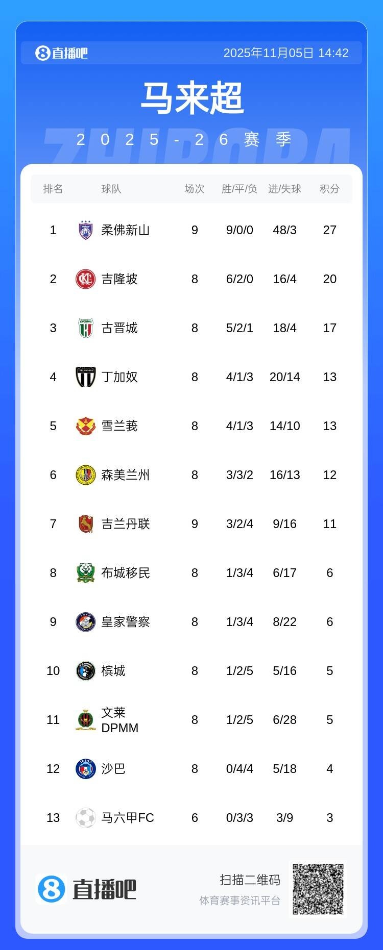 今晚战申花👊柔佛新山在马来超一骑绝尘,9轮全胜+进48球丢3球