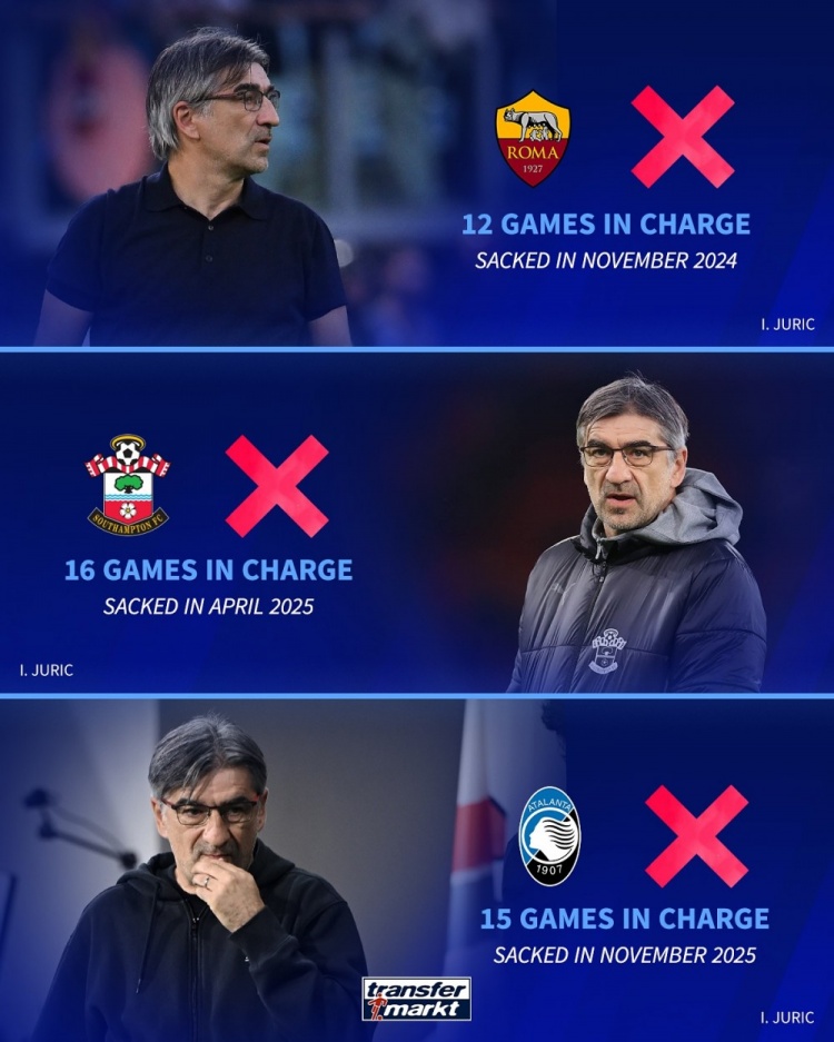 11月12日讯 亚特兰大宣布主帅尤里奇下课,尤里奇一年被罗马、南安普顿、亚特兰大三家俱乐部解雇,英超直播德国转会市场列出了本世纪指导教练员最短时间内连续被三家俱乐部解雇榜单,前四名尤里奇独占两席。