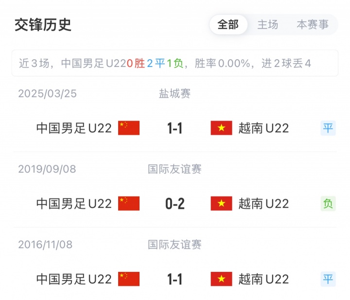 难求一胜!国足U22面对越南已遭遇4场不胜,近4次交手2平2负