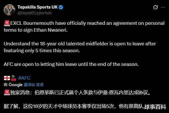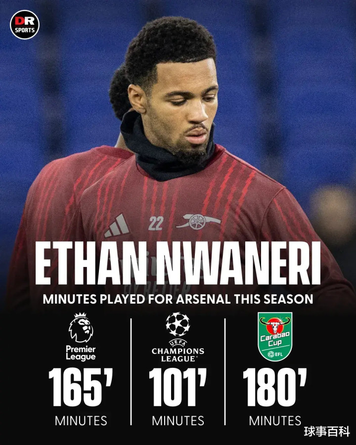 因此,恩瓦内里希望外租获得更多赛事 时间,樱桃军团成为潜在下家。这位18岁的球员被形容为“现象级的天才”,原本指望续约后能获得更多机会,但自从埃泽加盟后,他的出场时间便大幅缩水。尽管本赛季马杜埃凯、马丁内利、萨卡、特罗萨德和厄德高等人先后遭遇受伤 ,恩瓦内里依旧不受阿尔特塔的信任,出场时间骤降。