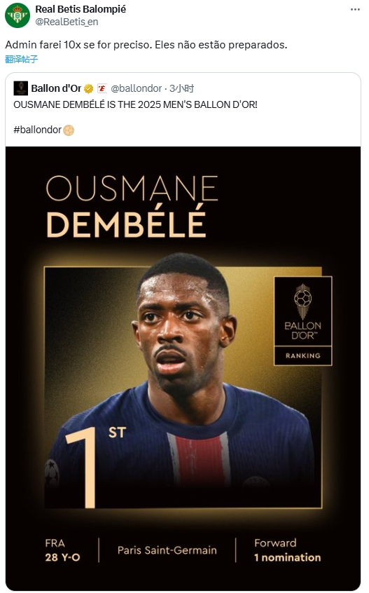 09月23日讯 2025金球奖由巴黎球员登贝莱斩获,贝蒂斯转发球员 员获奖的动态并表示:若有必要小编我会发十遍,他们还没准备好。