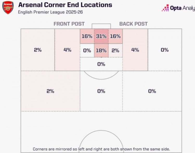 如今,阿森纳平均每场赛事 都能通过底线球攻入一球,这对争夺魁 军来说是一个很好的方式。从下图可以看出,他们的底线球策略 相当丰富,几乎有一半的底线球传向近门柱或远门柱,另有49%的底线球传向距离古代足球 门 12码内的中心区域,供身材高大的球员争顶。