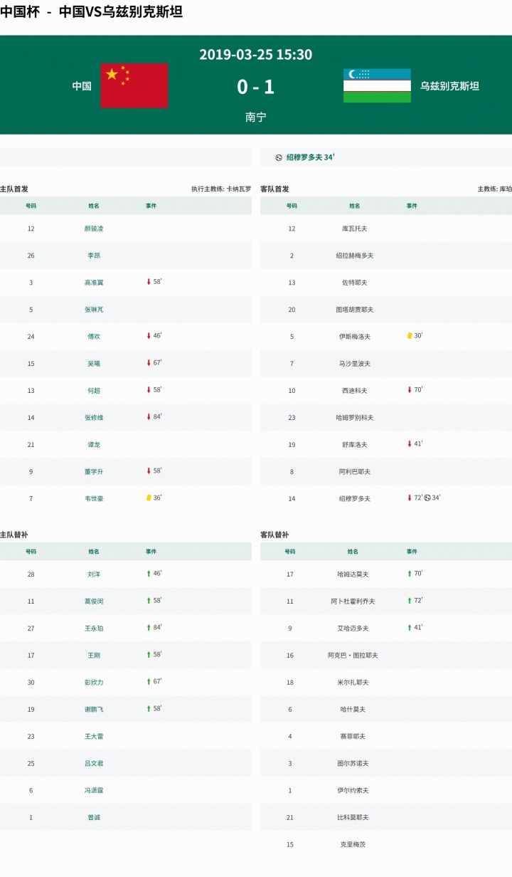 2019年3月25日,第三届中国杯第三名 争夺战在中国队和乌兹别克斯坦之间进行。上半场国足攻击 端毫无亮点,绍穆罗多夫爆射破门,英超直播韦世豪凶狠飞铲染黄,下半场对方错失多次良机。最终国足0-1不敌乌兹别克斯坦,当届中国杯两连败且一球未进,排名垫底。