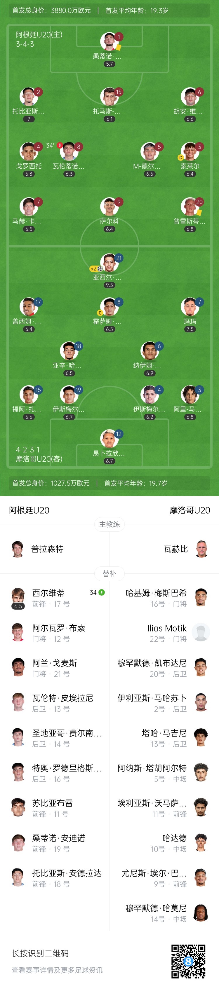 10月20日讯 北京时间7:00,世青赛决阿根廷U20对阵摩洛哥U20。上半场,阿根廷守门员巴比出击放倒对手,VAR回看后判决 了警告 +定位球,扎比里任意球得分!随后摩洛哥反击,扎比里再下一城!半场结束,摩洛哥U20暂时2-0领跑 阿根廷U20。