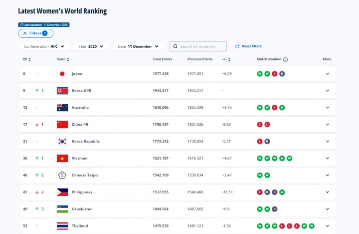 FIFA女足最新排名更新!
